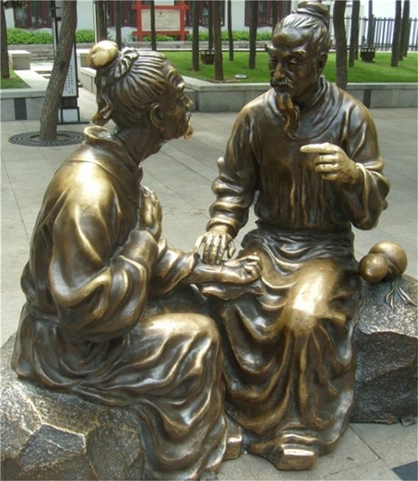 中醫(yī)文化歷史悠久,獨(dú)具特色。展現(xiàn)了中醫(yī)在進(jìn)行號脈問診的情景,放置在醫(yī)院或者中醫(yī)診所是很合適的。鑄銅人物雕塑就是以各種銅雕人物為造型的雕刻藝術(shù),用各種可塑材料或可雕,可刻的硬質(zhì)材料創(chuàng)作出一定的可視,可觸的藝術(shù)人物形象。